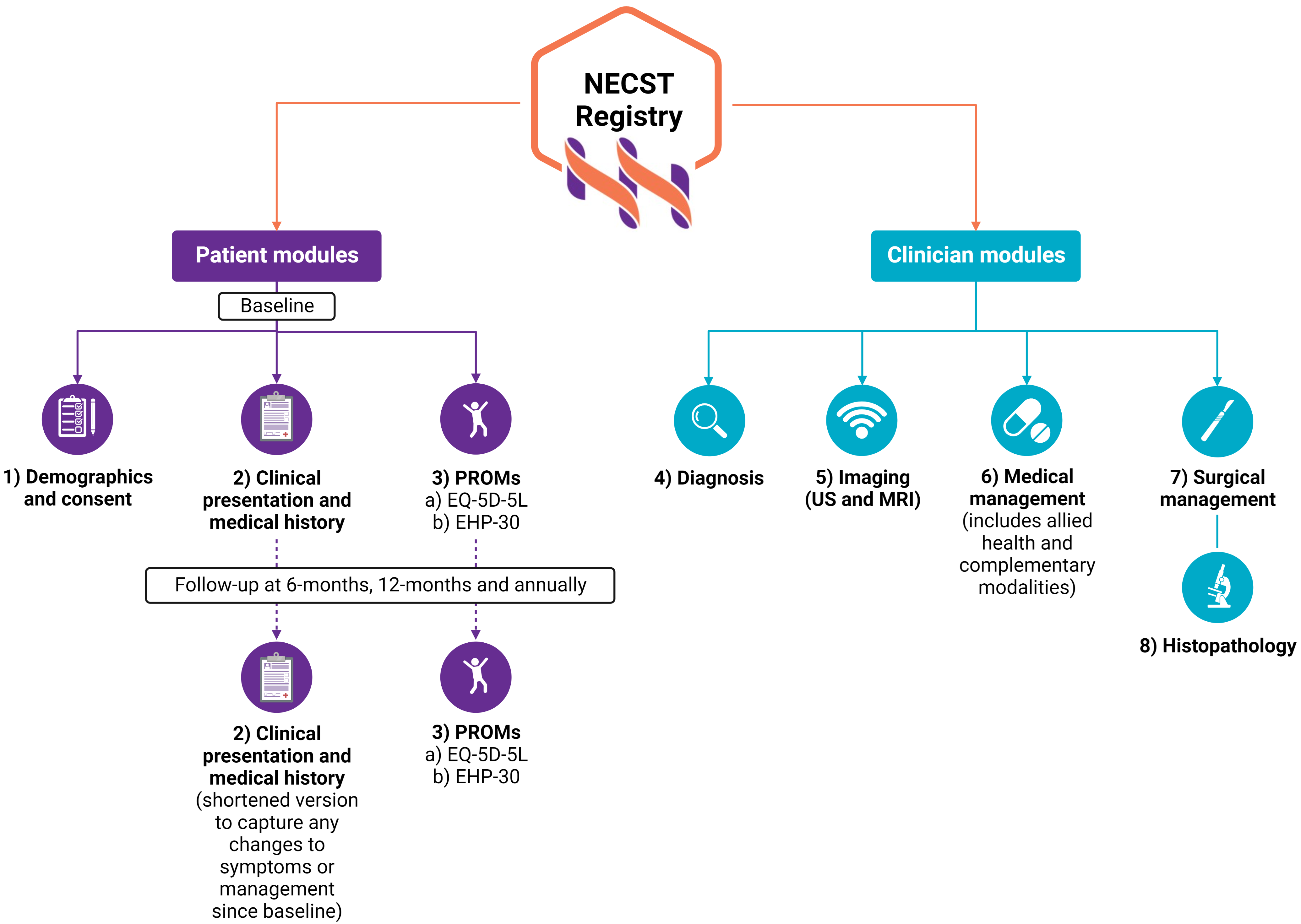 Each of these modules will contribute to the overall dataset in the NECST Registry. However, not all modules will be completed for each participant, since not all participants will require all interventions.